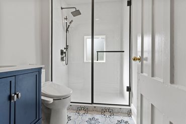 Pairing a bold tile pattern with sleek details gives this bathroom a welcoming and clean feel. We maximized sunlight with a minimalist full-glass shower door and included a shelf in the window sill.